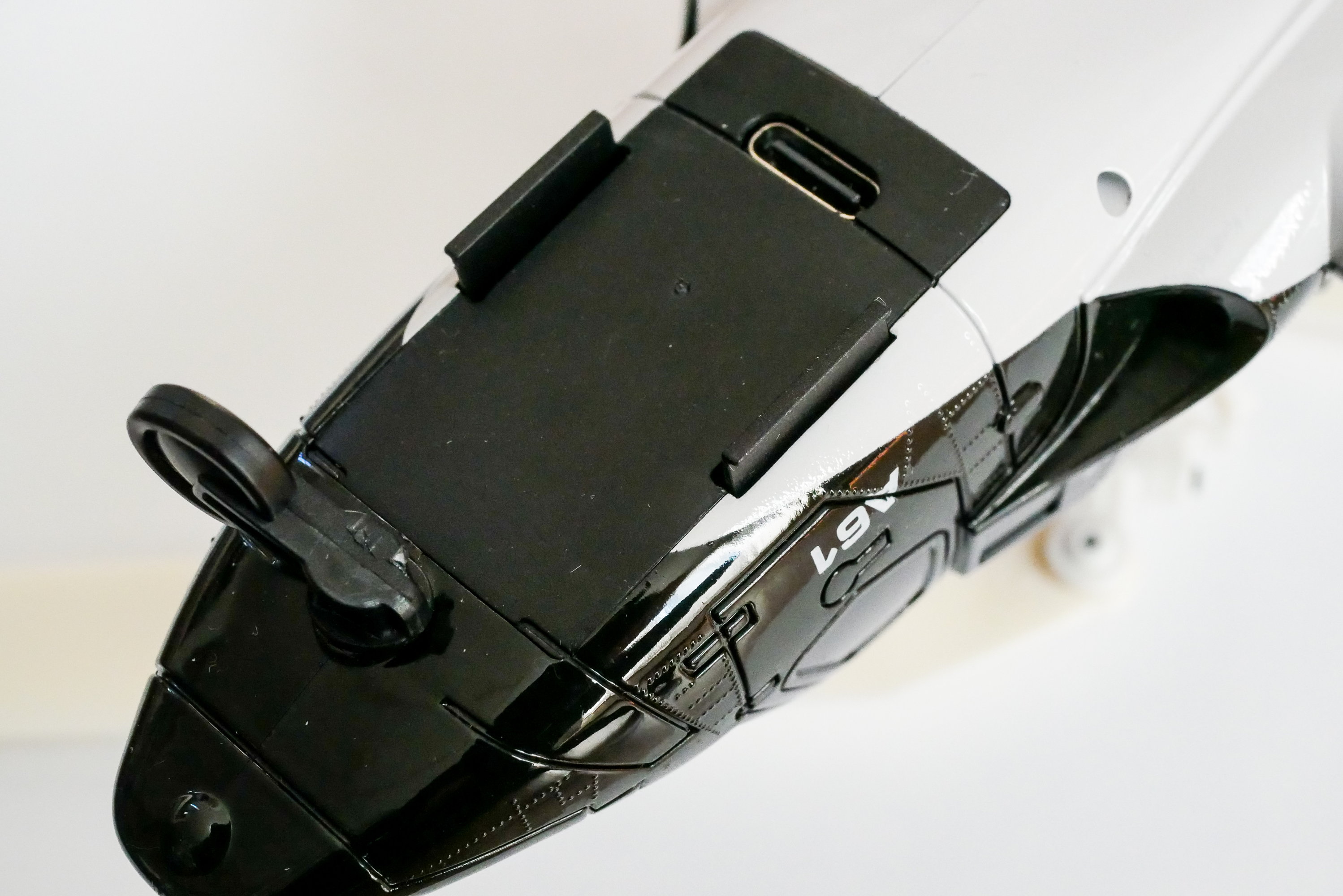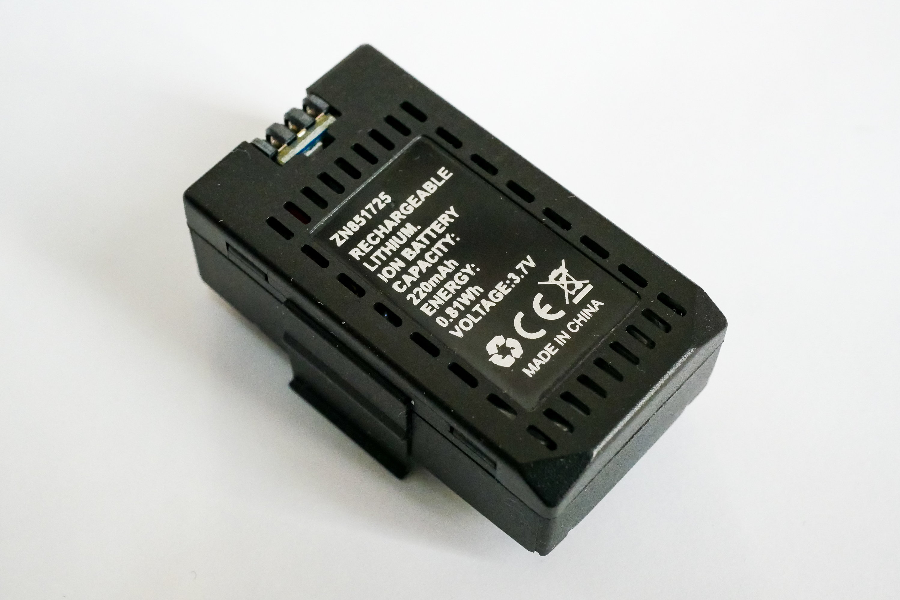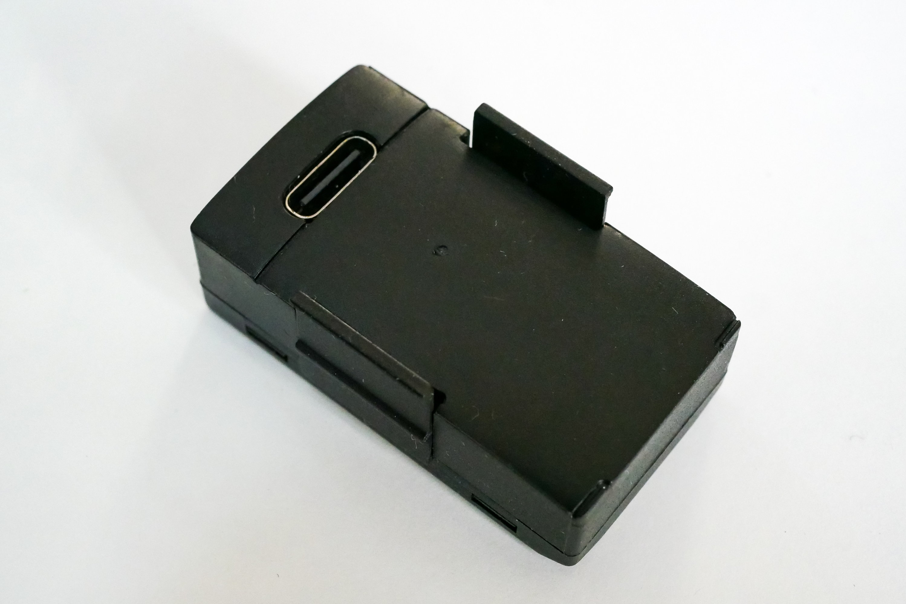 バッテリーは樹脂製ケースに収められています。充電用にUSB-Cコネクタが装着されており、付属のケーブルを使ってUSB-Aから充電します。機体側との接続には3点コネクタが使われています。